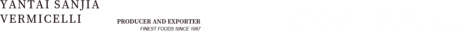 YANTAI SANJIA VERMICELLI CO.,LTD. was registered and established in year 1987,who specialized in Longkou vermicelli production,belonging to the Chairman Enterprise of Longkou vermicelli Chamber of Commerce in Zhaoyuan City, National Key Enterprise for vermicelli Production , Top Ten Enterprises in China's Starch Industry, and Key L...